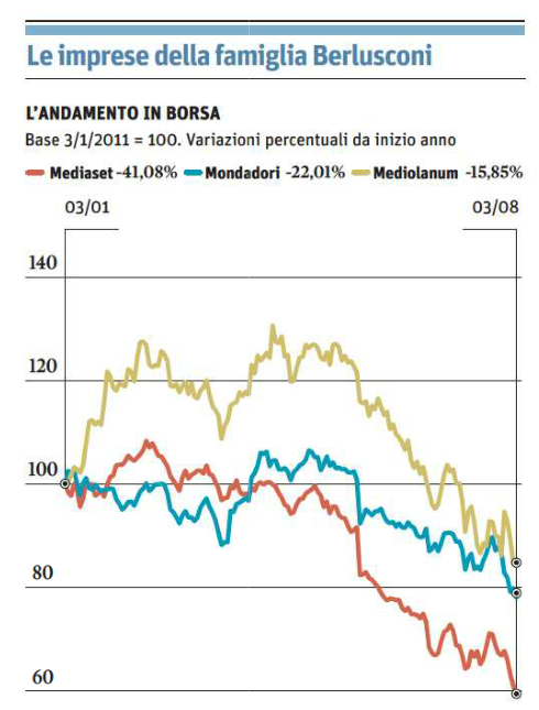 - Dal grafico pubblicato dal Sole24Ore e visibile qui che riporta l'andamento dei titoli del Cavaliere negli ultimi 8 mesi: MEDIASET al -41,08%, MONDADORI -22,01%, MEDIOLANUM -15,85%.